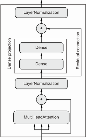 Figure 11.14 shows the full sequence-to-sequence Transformer. Look at the decoder internals: you’ll recognize that it looks very similar to the Transformer encoder, except that an extra attention block is inserted between the self-attention block applied to the target sequence and the dense layers of the exit block.