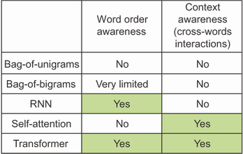 - There are two kinds of NLP models: bag-of-words models that process sets of words or N-grams without taking into account their order, and sequence models that process word order. A bag-of-words model is made of Dense layers, while a sequence model could be an RNN, a 1D convnet, or a Transformer.