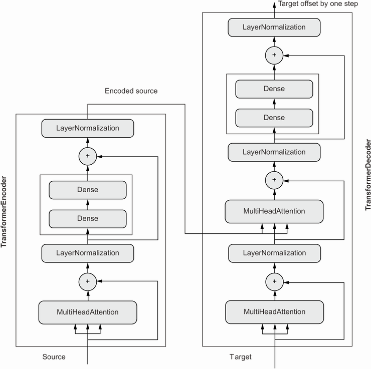 The end-to-end Transformer is the model we’ll be training. It maps the source sequence and the target sequence to the target sequence one step in the future. It straightforwardly combines the pieces we’ve built so far: PositionalEmbedding layers, the TransformerEncoder, and the TransformerDecoder. Note that both the TransformerEncoder and the TransformerDecoder are shape-invariant, so you could be stacking many of them to create a more powerful encoder or decoder. In our example, we’ll stick to a single instance of each.